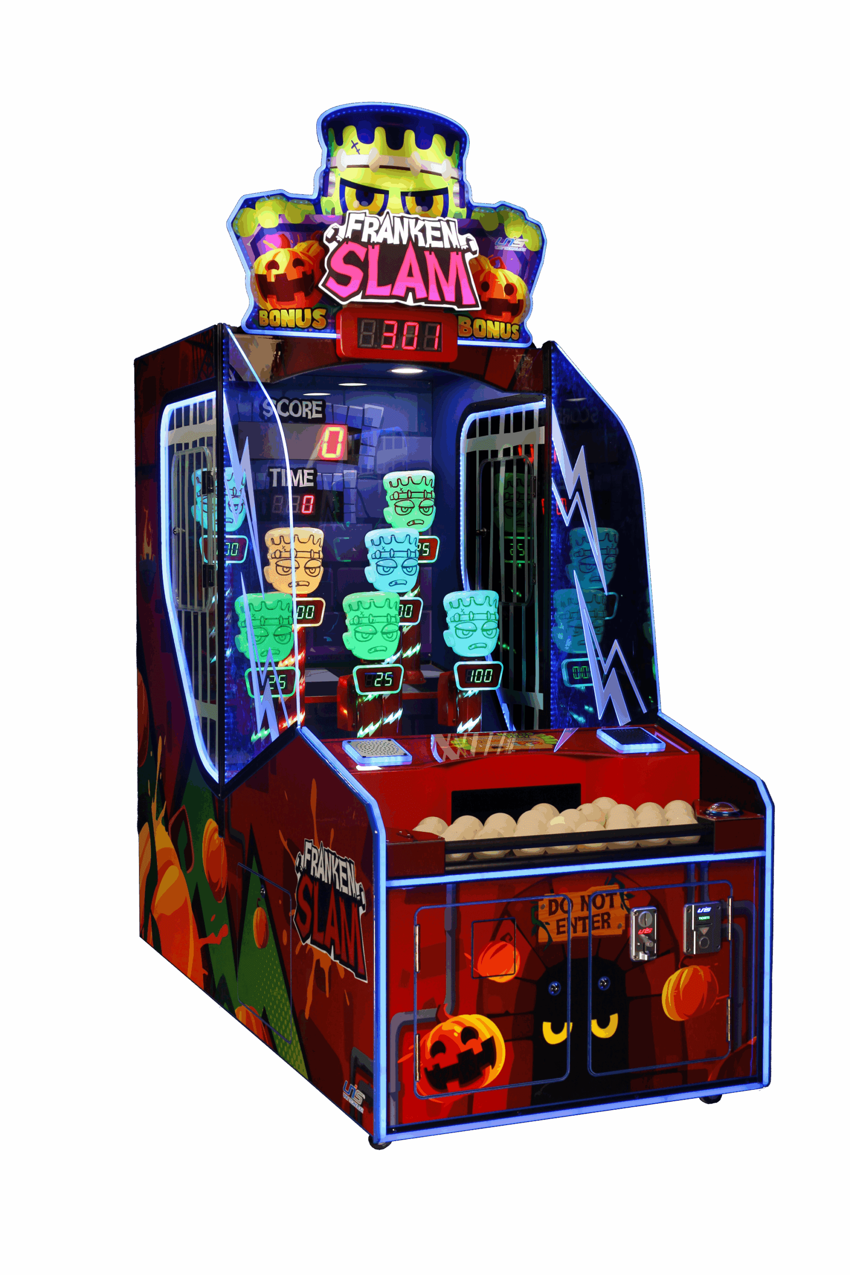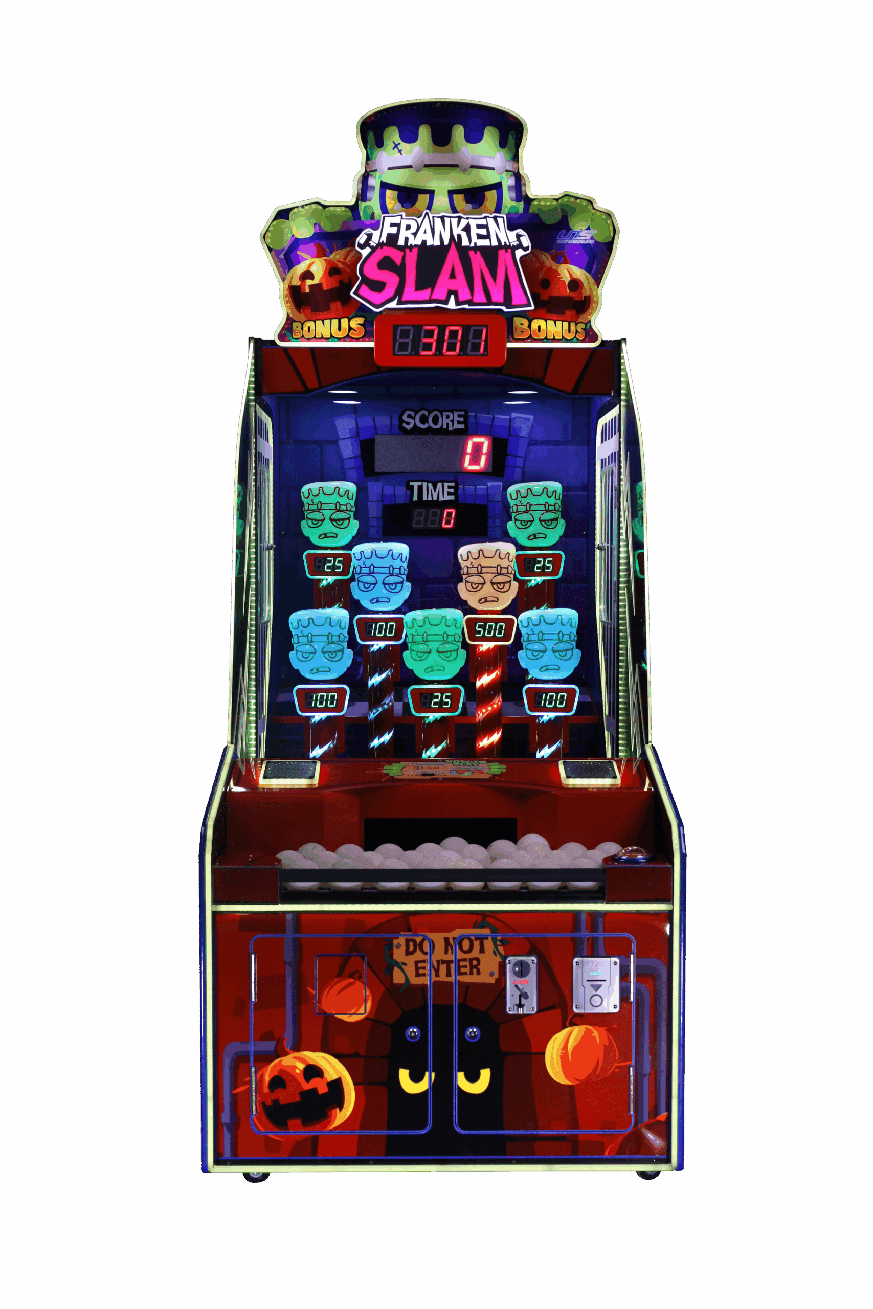 Franken Slam is a thrilling ball-toss redemption game where players race against time to knock down glowing Frankenstein heads. Each color target—green, blue, and orange—awards different points. Hit the bonus score to win extra tickets! Fast-paced, fun and skill-based, it’s a monster hit for any arcade or FEC.