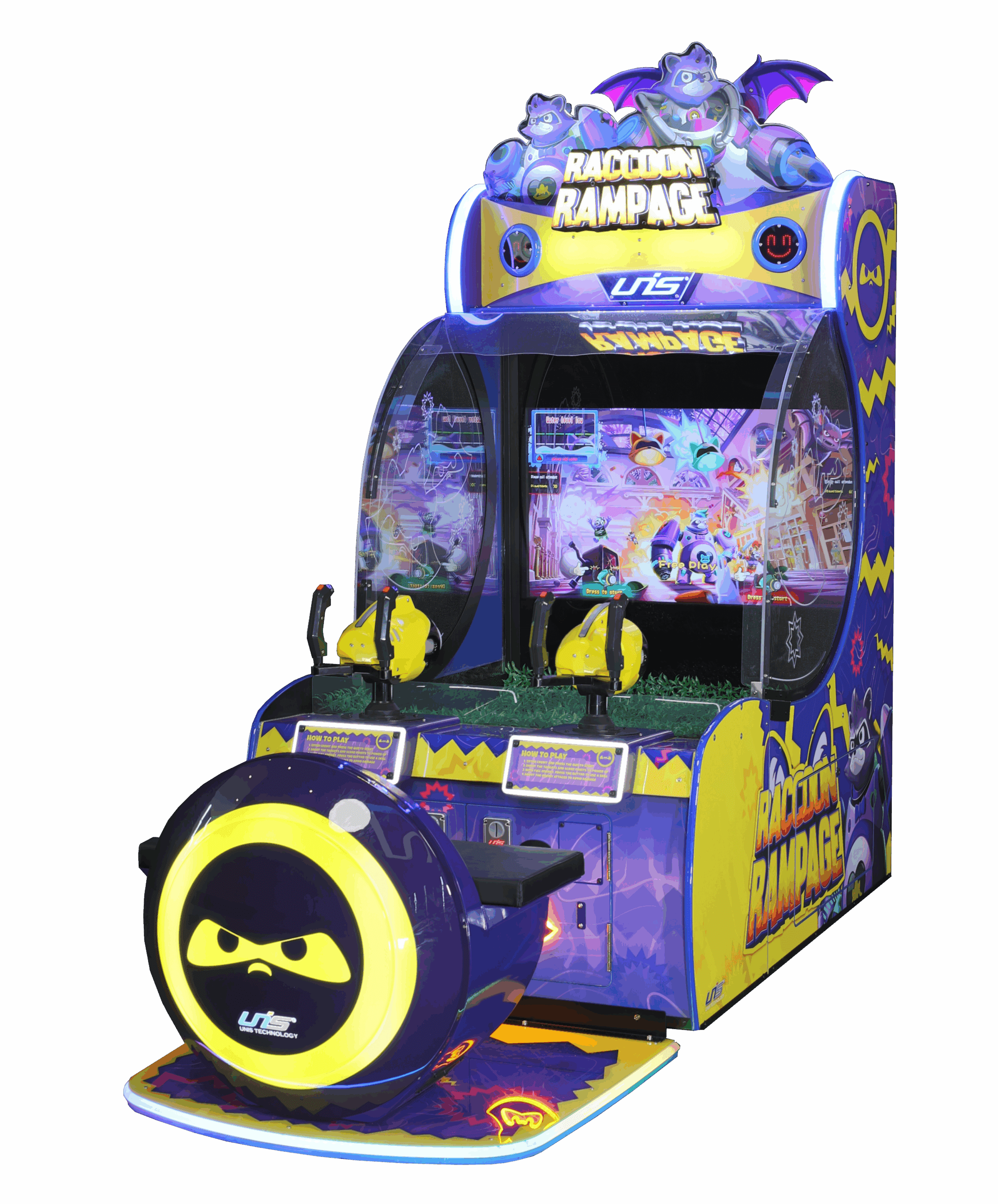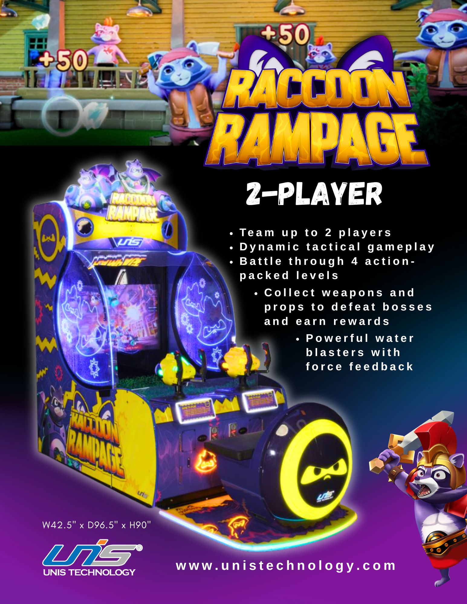 Raccoon Rampage 2P brings all the excitement of the original 4-player version into a space-saving 2-player format. Players team up to blast through four colorful stages using force-feedback water blasters, earning points, defeating bosses, and unlocking powerful upgrades. Perfect for smaller arcades, route operators, and high-traffic venues with limited floor space.