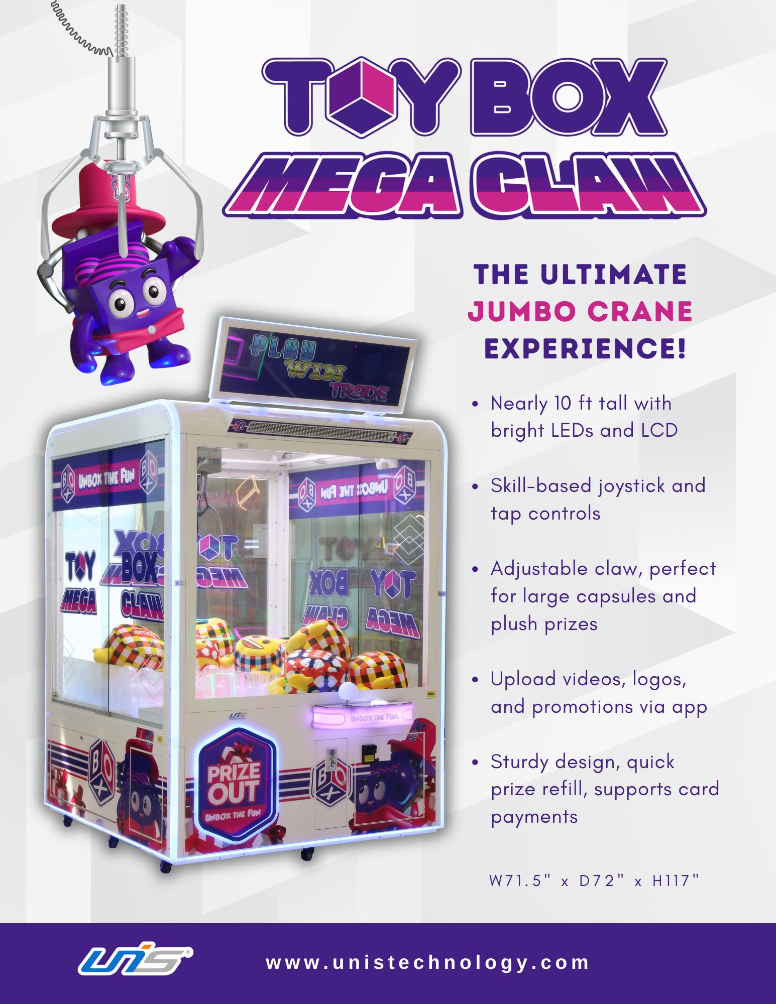 Mega Claw is the ultimate jumbo crane machine built to make a statement. Standing nearly 10 feet tall, this eye-catching centerpiece features vibrant LED lighting, a massive LCD screen, and a spacious playfield made for oversized plush and prize capsules. With classic skill-based gameplay and advanced operator controls, Mega Claw is perfect for drawing crowds and maximizing revenue in any high-traffic location.